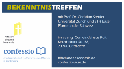 Wir, die Pfarrerarbeitsgemeinschaft Confessio und die NBB-Regionalgruppe Württemberg, laden zu einem Bekenntnistreffen nach Ostfildern-Ruit ein. Mit einem hervorragenden Referenten. Mit einem spannenden Thema. Mit einer Pause der Begegnung, in der man wertvolle Mitchristen treffen kann, die mitdenken und mitkämpfen fürs Evangelium. Sind Sie dabei? Bringen …