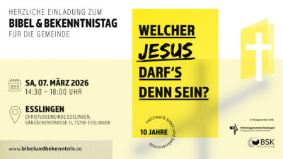 Herzliche Einladung zum Bibel- und Bekenntnistag in Esslingen! Unser Netzwerk ist vor 10 Jahren notgedrungen entstanden. Die Herausforderungen für bekennende Christen sind nicht kleiner geworden. Darum laden wir zur persönlichen Begegnung nach Esslingen ein. Wir wollen Orientierung und Ermutigung geben. Macht das Treffen in Euren …